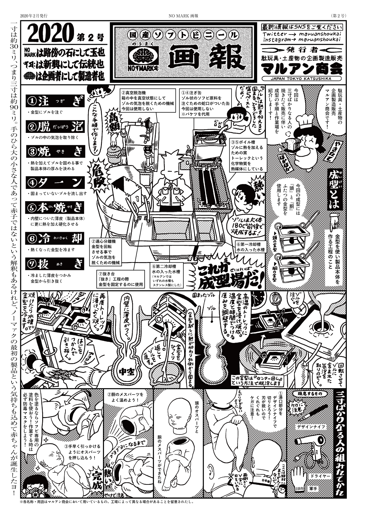 「成型場」及び「スラッシュ成型工程」の図説、『三寸ばかりなる人』の実演販売の実施、同組み立て方法の解説