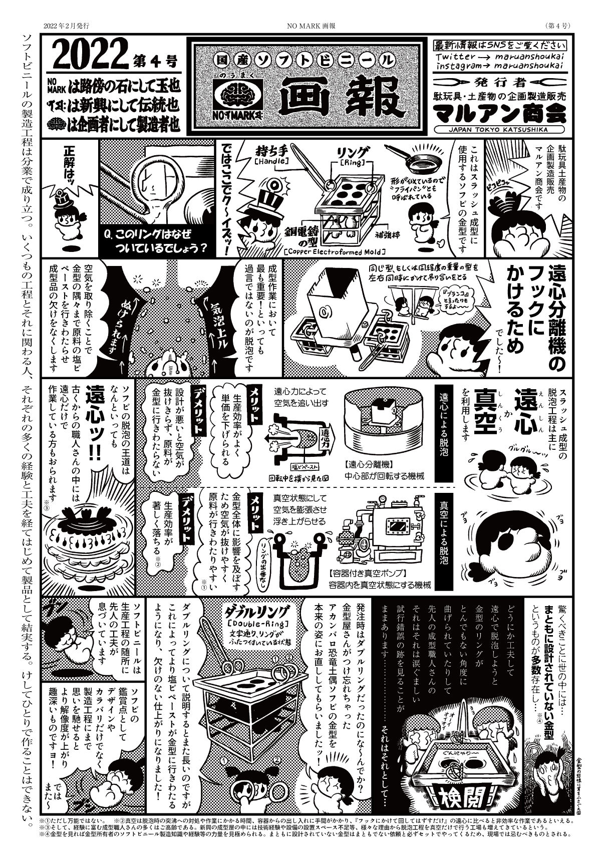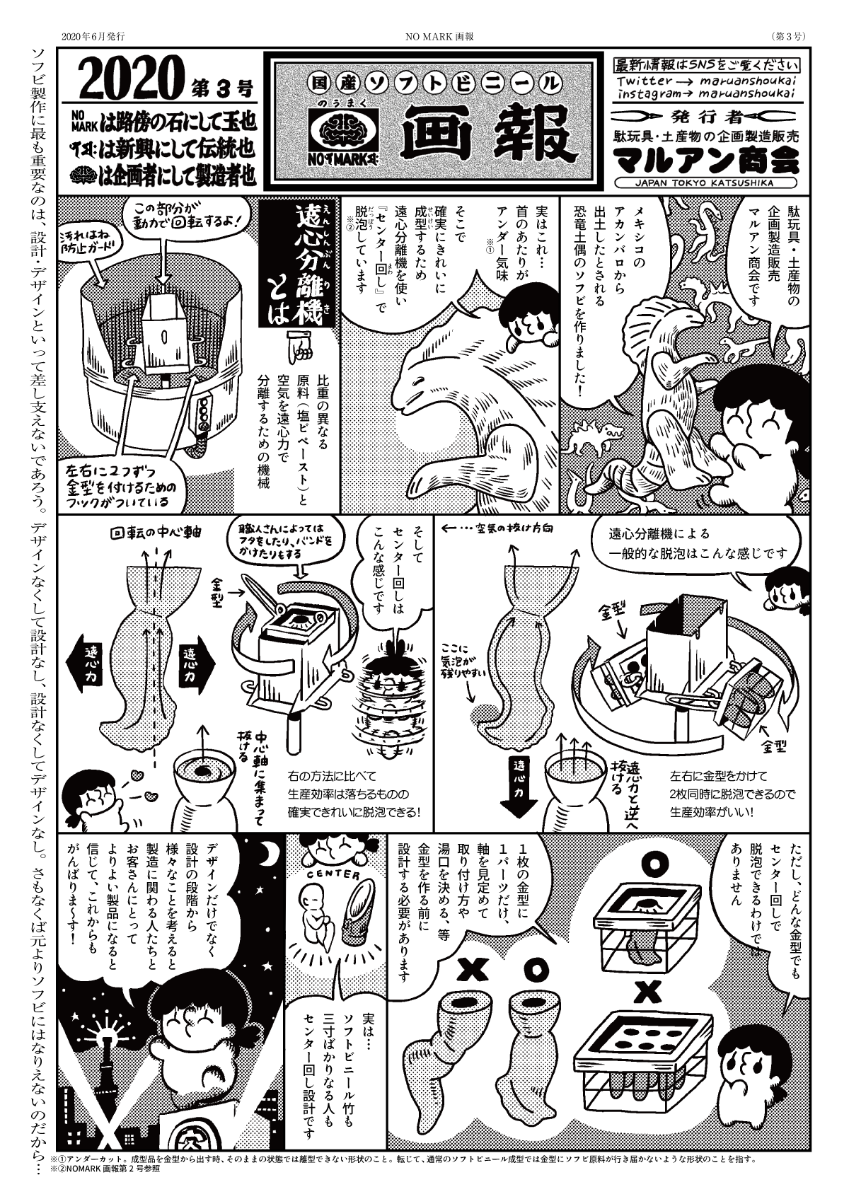 「遠心分離機」による「脱泡」工程における「センター回し」の解説、自社製品『アカンバロ恐竜土偶』ソフビ発売